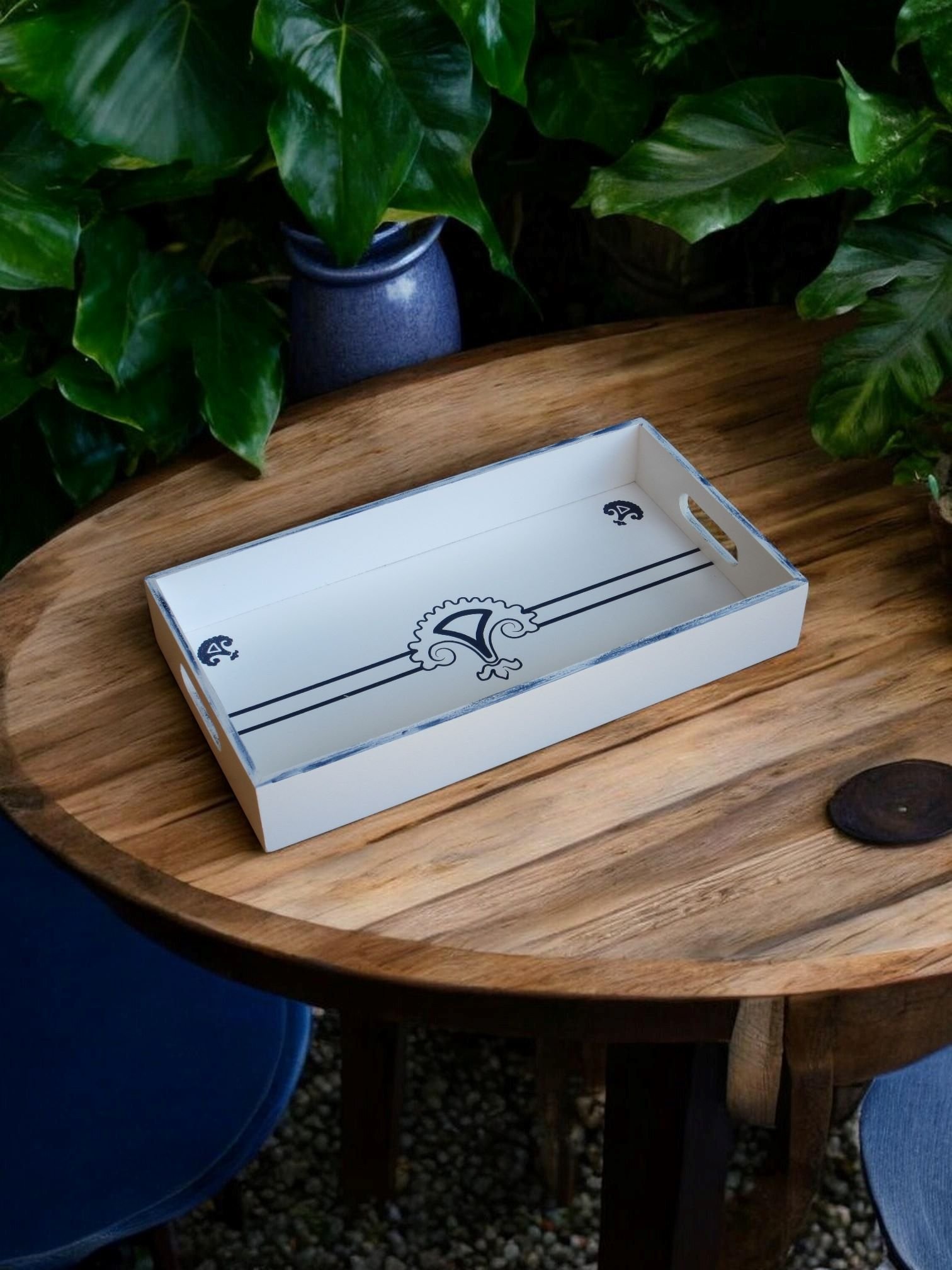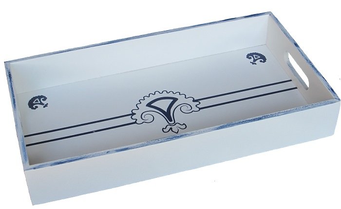 A Bandeja Retangular Coleção Gorges é de madeira, pintada de branco com desenhos em azul ..