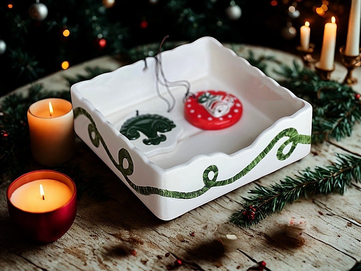 Porta Guardanapos Natal G feito em cerâmica esmaltada na cor cru com desenhos externos em vermelho ou verde .