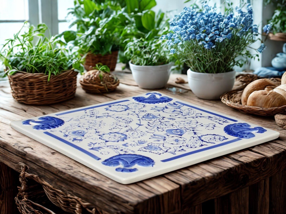 Tábua dequeijos e frios, feita em cerâmica esmaltada e pintada à mão, nas cores cru com desenhos azuis.