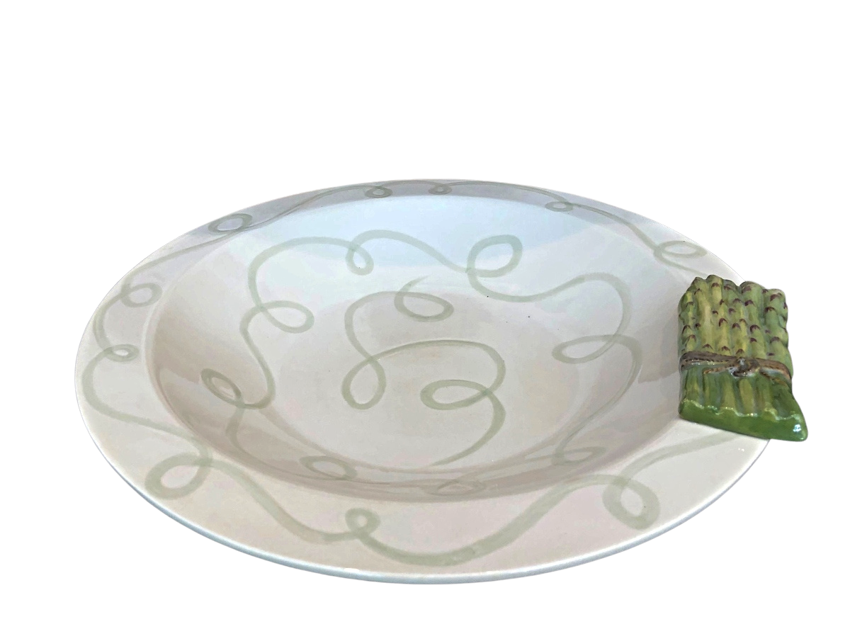 Na sua borda tem um maço de aspargos que foi modelado e pintado à mão.